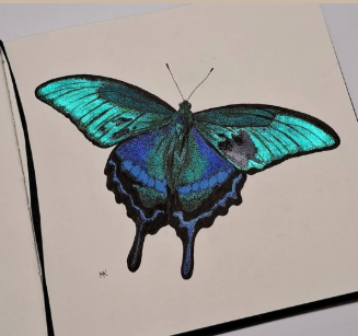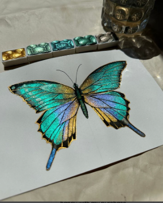 Am desenat un fluture cu o pensulă fină, apoi am adăugat reflexii aurii. Rezultatul este impresionant, chiar și pe hârtie închisă ✨🦋